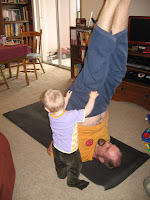 I was practicing some yoga postures on Easter morning when Sasha (short for Alexander), my 17-month-old son, crawled over and starting climbing on me.  It seems like when I want to hold him he just wants to crawl away, but when I let him be to do some yoga or something then he wants to climb all over me demanding my full attention.  He is not walking yet, so this morning he decided to use me in shoulderstand (sarvangasana) as a prop to stand up.  He finds it hilarious when I try to practice yoga postures.  Although my shoulderstand is far from perfect as you can see in the picture, with Sasha hanging on to my pants laughing at me - this was a perfect posture for a perfect moment.